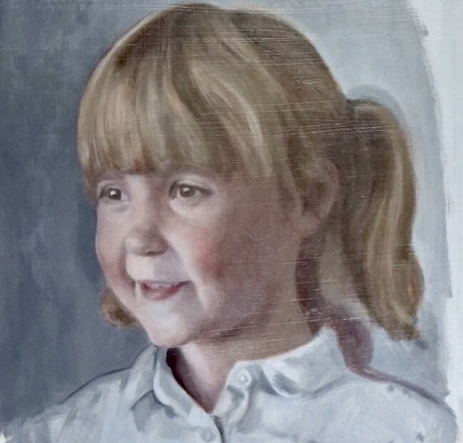 portrait of millie, 1st glaze, oil on board, portrait painting commission